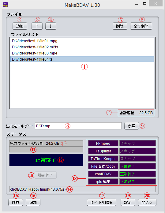 「作成」ボタン(図1⑮)をクリックするとBDAVファイルの作成が始まります。