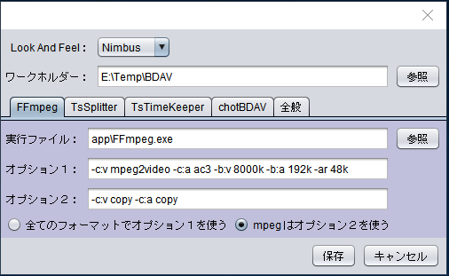 MakeBDAVで使用するソフトの配置場所、オプション等をタブで切り替え設定します。